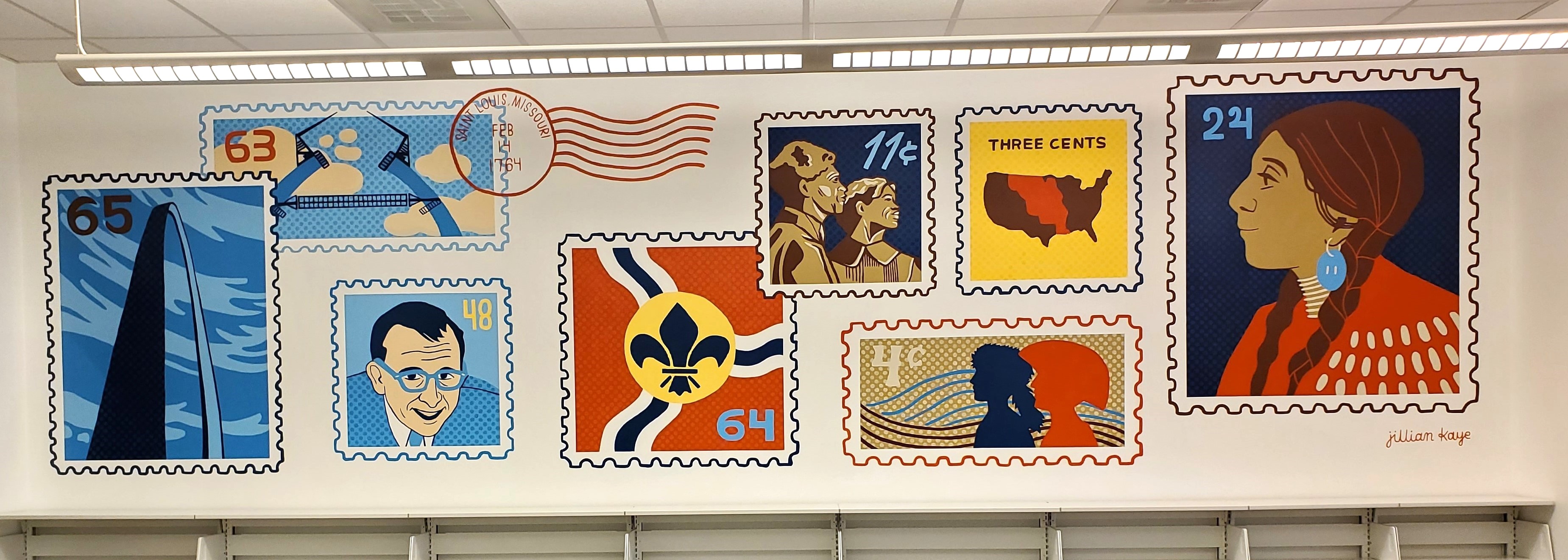 Our panel of judges has selected St. Louis artist Jillian Kaye as the winner of the mural competition. Her design features illustrated postage stamps depicting westward expansion, the Arch, Dred and Harriet Scott, and the Lewis & Clark expedition, with each faux postage value tied to history.
